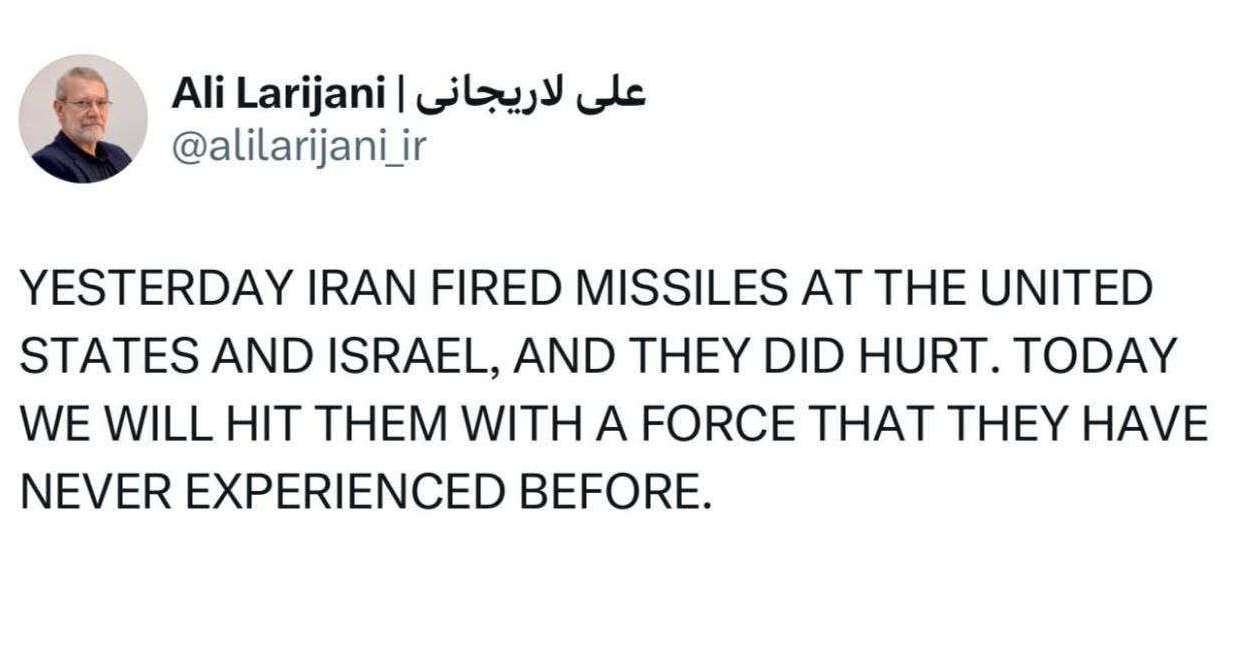 伊朗最高国家安全委员会秘书拉里贾尼发文称,昨天配资平台预警网,伊朗向美国和以色列发射了导弹,他们确实感到疼痛。今天,他们将遭受“从未感受过的打击。”(总台记者 李健南)